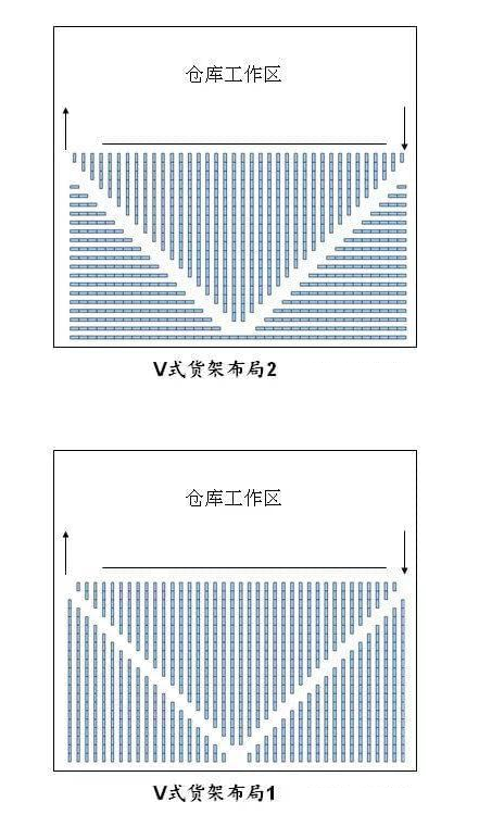 這兩種布局方式,相比于下面這種,經(jīng)那篇外國文章的作者測試,V式貨架布局1提高效率11%多,V式貨架布局2提高效率23%多。