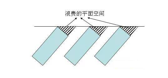 從上圖可以看出,無論橫式還是豎式貨架布局,貨架長度方向均是垂直于主干道方向的。我們所常見的倉庫布局大致都是這樣,為什么會有這樣的千遍一律? 首先,我們來分析電商倉庫的設(shè)計,它的思路來源于傳統(tǒng)倉庫的設(shè)計。對于傳統(tǒng)倉庫來說,只要你倉庫不是圓的,那么貨架或垛位垂直或平行于墻壁方向是最能充分利用空間的。而當(dāng)你的貨架或垛位和墻壁之間有夾角時,勢必會造成平面空間的浪費(fèi),如下圖: